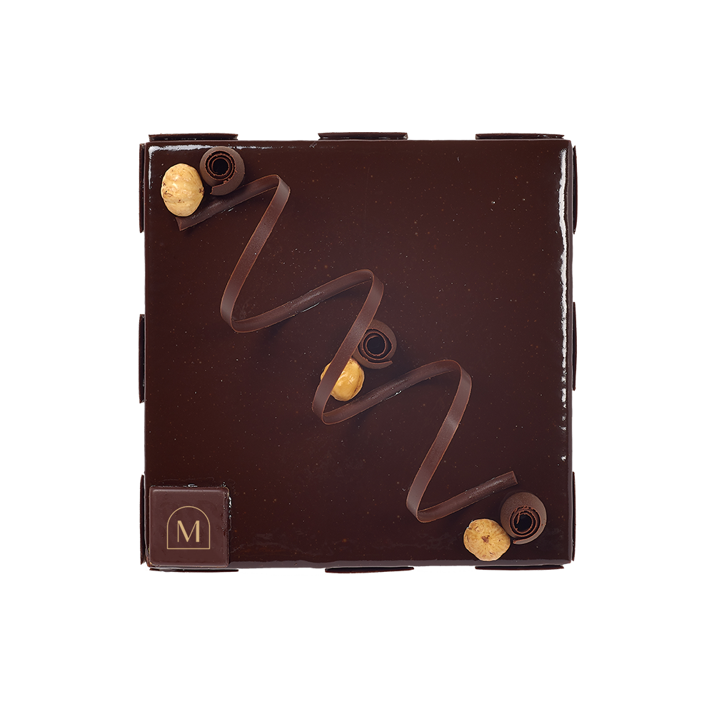 La più melodiosa sinfonia al cacao fa danzare nocciole e mandorle tra strati di morbido Pan di Spagna alla farina di riso al cacao, croccantino con corn flakes, cioccolato al latte Jivara 40%, pralinato croccante di mandorla e nocciola, Bavarese alla nocciola con “base caramello” e scagliette di cioccolato, mousse al cioccolato fondente monorigine Manjari 64% dal Madagascar.